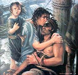 The wife of Nephi was a woman of courage and compassion. Here she comforts Nephi, who was bound with cords on the ship by his rebellious brothers (see 1 Ne. 18:11, 19–20).