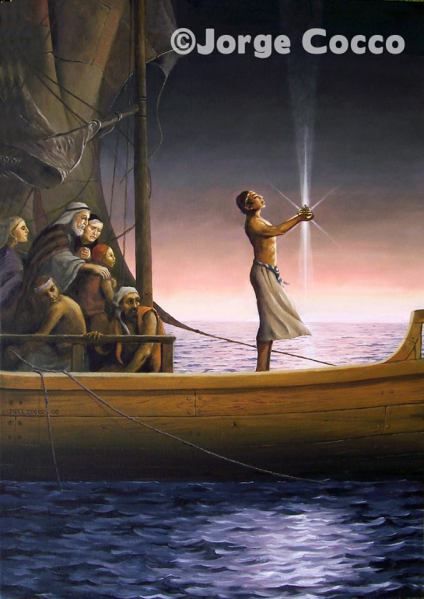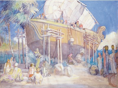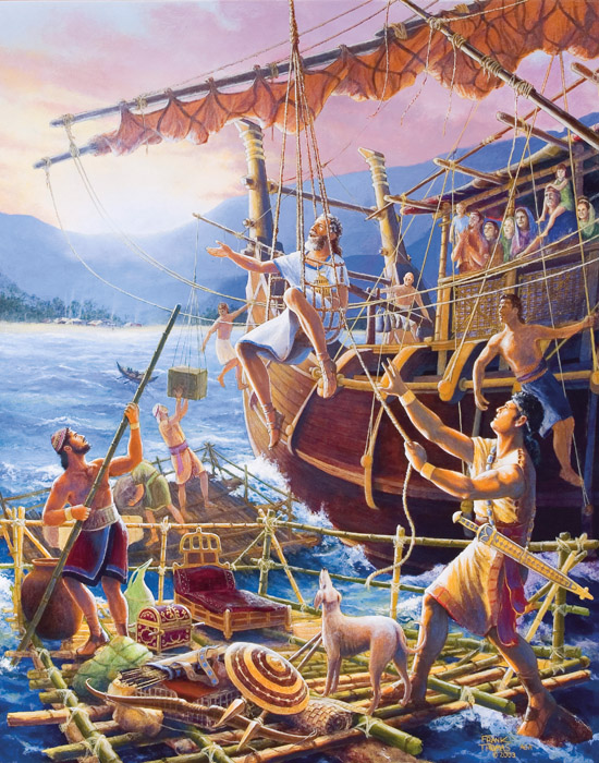 The question when painting LEHI AND HIS PEOPLE ARRIVE IN THE PROMISED LAND was, how to picture Nephi’s ship. In the Book of Mormon we read the puzzling words that it was not built after the manner of men. So what did it look like? Again, Mr. Words can duck, but Mr. Pictures can’t. He must paint something that somehow satisfies us as looking real and reasonable. Faced with this decision, I reasoned that God, who works by natural laws, not in defiance of them, isn’t going to instruct Nephi to build a bizarre oddity defying all engineering logic, just to be different from man’s usual designs. Just to conjecture, God’s instructions to Nephi might have revealed something merely in advance of its time, unknown in that period of ship building. Possibly such a simple thing as the steering rudder, not yet invented in Nephi’s time, might have made his ship “not after the manner of men.” At least we may be sure that they did have sails. For we are told they “were driven forth before the wind.”