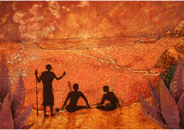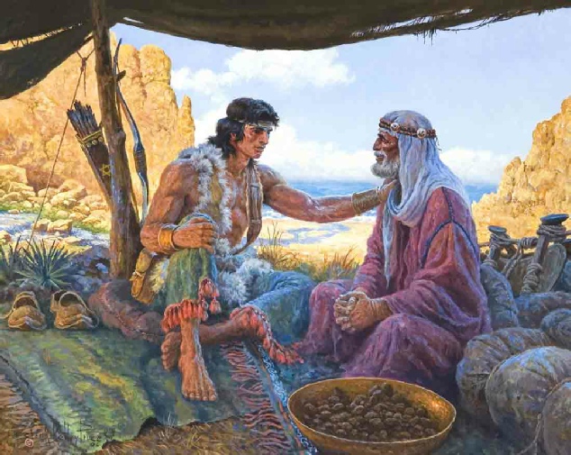 I am depicting the incident from 1 Nephi, chapter 3, where Nephi returns from speaking with God to the tent of his Father and learns that he is to go to Jerusalem to get the brass plates. His father tells Nephi that he has already spoken to Laman and Lemuel and that they have said the assignment is too hard. Nephi brings joy to Lehi when he tells him that he will do it because he believes the Lord will help them do it. The message of my painting is that Nephi set a great example and heritage of faith for the whole Church forever by what he said and did.