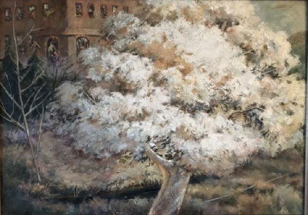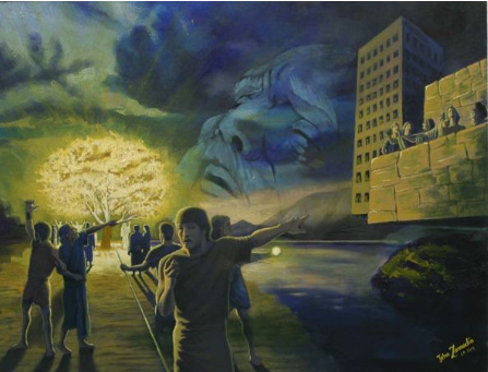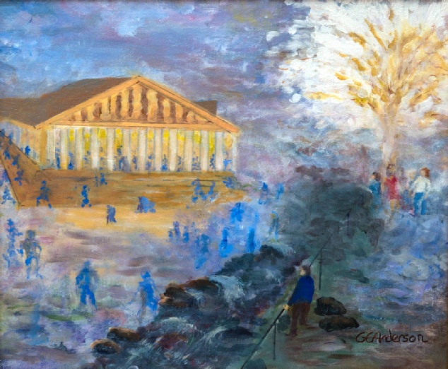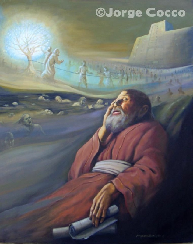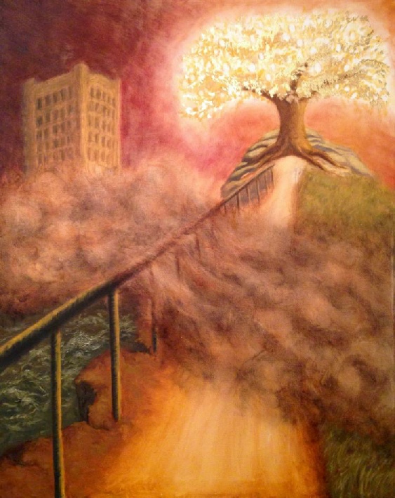 This is my realization of a dream had by Lehi, a powerful prophet of God from ‘The Book of Mormon’. He saw a large open field. In this field he could see a large tree that was white. The tree had beautiful fruit. He walked up to the tree and partook of the fruit. It tasted wonderful to him so he wanted his family to also taste it. He looked and saw his mother and his sons and invited them to come enjoy the fruit with him. He looked for other sons who were a great distance away. When he invited these sons they refused. There are other items in this picture to help us understand this dream. There was a rod of iron leading to the tree. This rod of iron traveled a mist of darkness before it got to the tree. When he looked around he could see there was a river between the tree and a great and spacious building. When his prayer was completed, God revealed the meaning of the items in the dream. He began to understand that the Tree of Life providing fruit that brought them into the presence of God. The rod of iron was the word of God bringing people to the Tree of Life. Many people were trying to enter the great and spacious building, which represents the cares of the world and the physical desire. It makes it more difficult to choose which one to follow; the path of Satan or the plan of our Heavenly Father. Look at my blog for a full description.