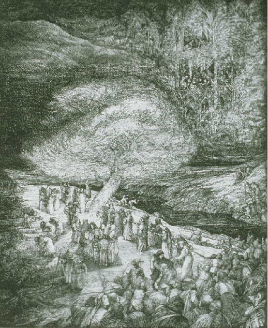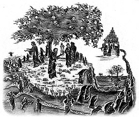 The artist suggests that some who set out for the fruitful tree of life may be lured toward barren trees shown at the right of the print.