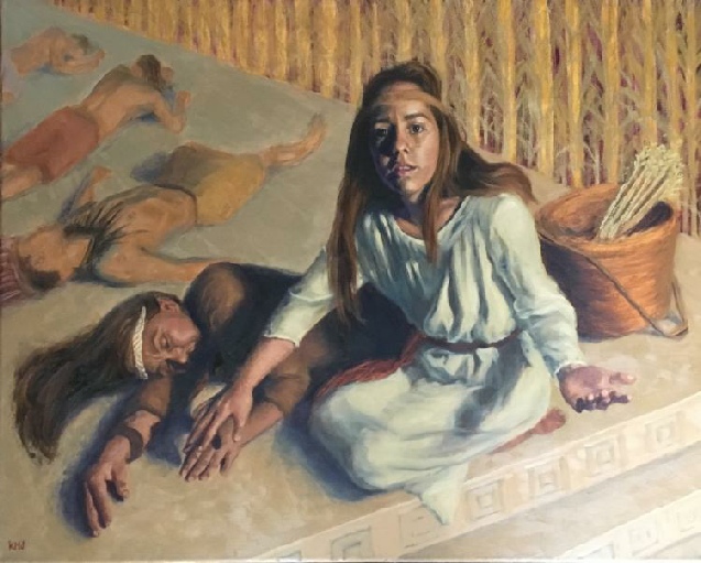 I chose to portray the story of Abish at the moment right before she touches the Queen. Although Abish's story is a small part in the Book of Mormon, I find it to be incredibly powerful and inspirational. When researching for the piece, I made a list of several verbs describing Abish's actions. She saw, she ran, she gathered, she wept, she believed, she touched. I took these into account when creating this highly symbolic piece. Abish and the Queen are painted in dramatic lighting and suspense, and although difficult to detect in the photo, the crops contain hints of gold. Abish was painted on a 24" x 30" canvas in oil paints.