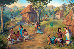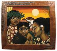 painting, mixed media collage, by Sylvia Huege de Serville, Takapuna Ward, Auckland New Zealand Harbour Stake. Polynesian descendants of Book of Mormon peoples receive and accept the Book of Mormon—the stick of Joseph (see Alma 63:5–8; “Conference in Samoa,” Ensign, April 1976, 74).