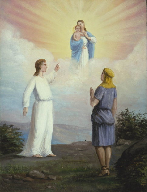 The figures of Mary and the Infant Christ are depicted very clearly in the midst of an indistinct background. As befits Nephi's unwavering focus during the vision, there is nothing in the background to distract the viewer from the message in the vision. All elements, even color and light, point to the center of our existence, Jesus Christ, just as the Spirit of the Lord makes it clear to Nephi that the reason he was shown what his father saw was so that he could bear his own witness of Christ.