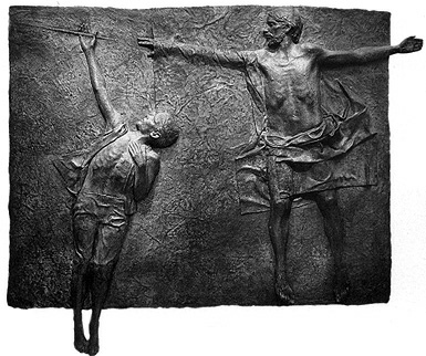 The vessel immediately behind the figures is an oil cask symbolizing the Savior's