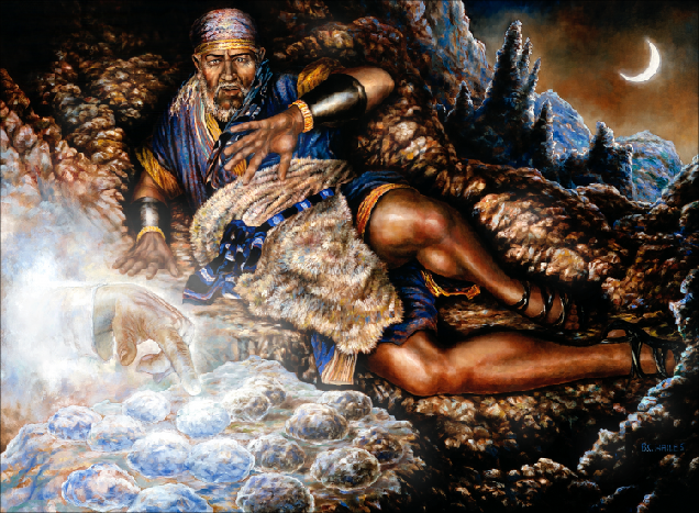 The compelling element of the story of the Brother of Jared and the miracle of the Lord touching the stones to give light in the barges is the result of basic faith and the acts which preceded it. The artist painted the Brother of Jared in the simple act of sorting some of the stones he will take to the Lord. Not every part of a miracle is spectacular. Indeed, that is rarely the case.