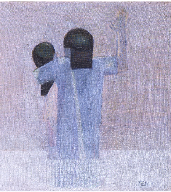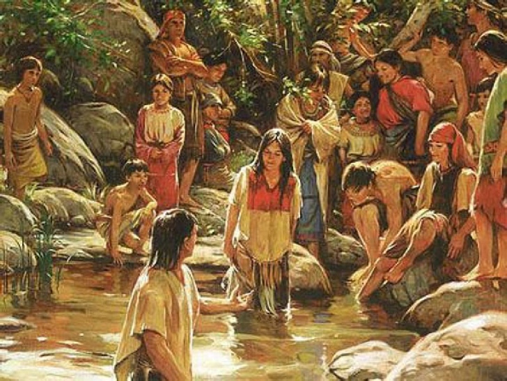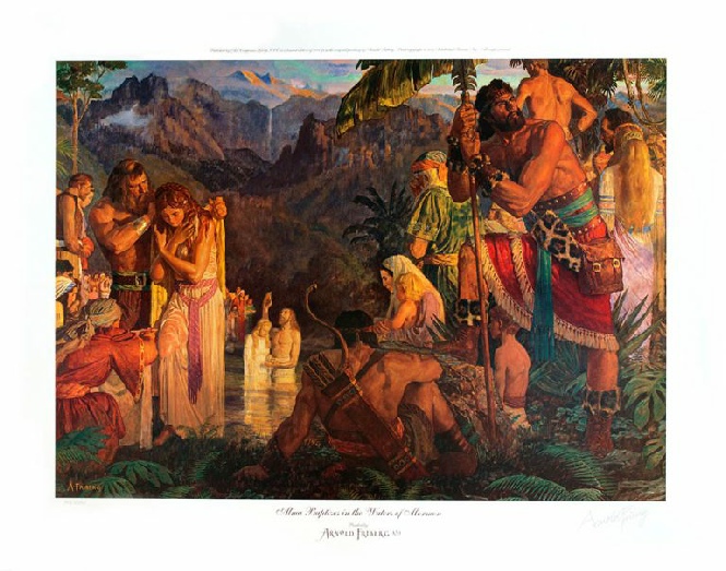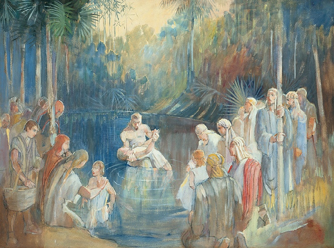 Minerva Teichert depicts the baptism of the faithful followers of Alma in this lush setting of water and vegetation. Men and women wait patiently for their turn to receive the precious ordinance.
