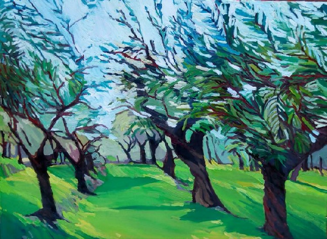 This piece explores the symbolic use of olive trees in the scriptures. Jeremiah 11:16 states that it is an honor to be likened to an olive tree: “The Lord called thy name, A green olive tree, fair, and of goodly fruit.” The promise of God’s covenant blessings is symbolized in the tame olive trees, and our individual lives and works in the good fruit. The painting is set in the modern day to represent the gathering of the house of Israel and the final proliferation of good fruit. It testifies of the Savior’s ministry of hope and salvation.