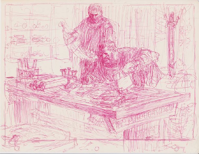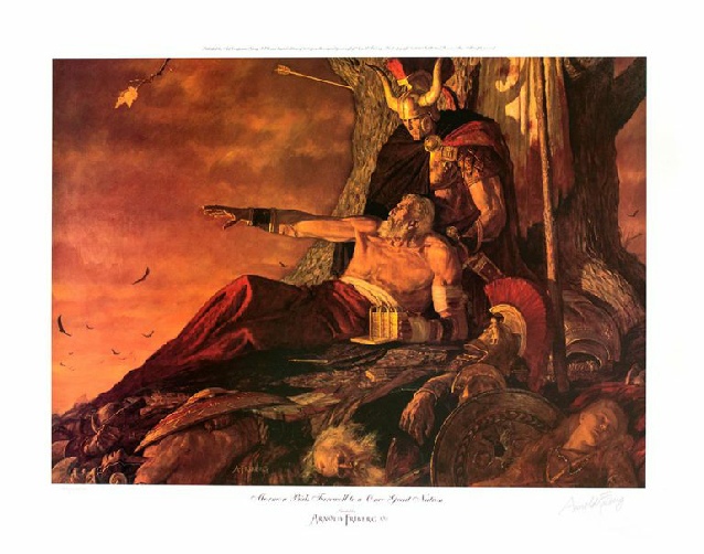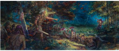 The artist felt and strove to capture the epic, downright Wagnerian tragedy of the solemn scene at the end of the last battle. Mormon has been fatally wounded in the fight, and so they have laid him down on the hilltop, supported by his son Moroni. As he grieves for his fallen people, he holds the plates of gold, graven with his own hand, leaving a few plates for Moroni to add some final words. That one last leaf on the tree carries its own symbolism, as well as the buzzards circling over the tragic scene.