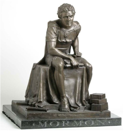 This sculpture portrays Mormon at the time he first enters into the hill Shem. He is twenty–four years old and he looks at the awesome task before him that includes reading and abridging records created over a period of one thousand years. His faith in the Lord will strengthen him to honorably complete this and further assignments.