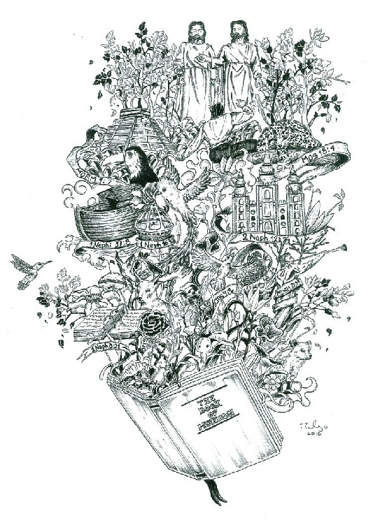 Christian is a freelance illustrator living in Ecuador. This piece interweaves some of the key events and symbols represented in the Book of Mormon. The Salt Lake Temple is featured in the center right, with the angel Moroni posed below. Nephi’s ship bound for the promised land is depicted in the center left, flanked by the Liahona. The entire piece is crowned with a depiction of the First Vision, as the final piece in the Book of Mormon’s narrative, and the beginning of the Restoration. This piece is meant to demonstrate how the Book of Mormon explores varied themes and ideas, yet connects and encapsulates them into one great whole.